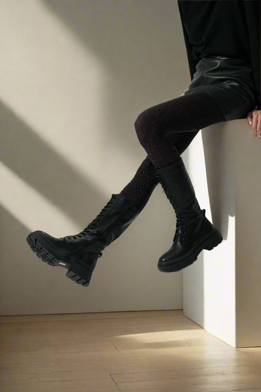 Οι WORKSHOP Emmalyn Black μπότες έως το γόνατο προσθέτουν μοντέρνο, δυναμικό χαρακτήρα με λιτή γραμμή...
