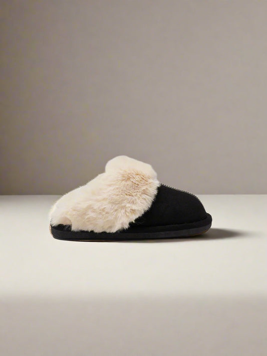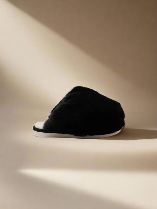 Γυναικείες παντόφλες με οικολογική γούνα σε κομψό μαύρο χρώμα και ανοιχτή φτέρνα, ιδανικές για άνεση...