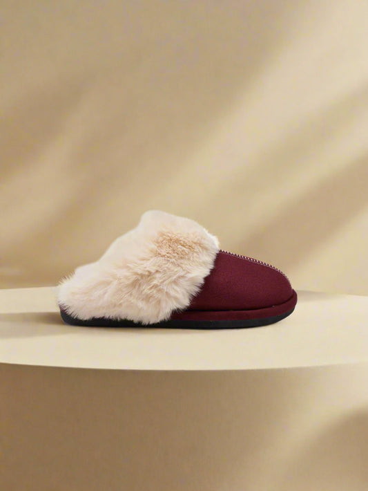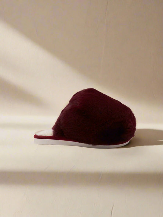 Γυναικείες παντόφλες με οικολογική γούνα σε κομψό μπορντώ χρώμα και ανοιχτή φτέρνα, ιδανικές για άνεση...