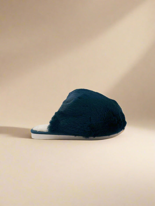 Γυναικείες παντόφλες με οικολογική γούνα σε κομψό πετρόλ χρώμα και ανοιχτή φτέρνα, ιδανικές για άνεση...
