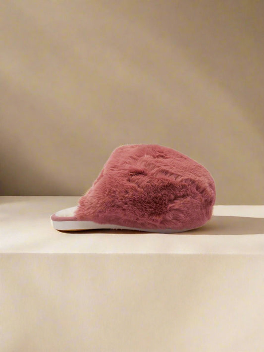Γυναικείες παντόφλες με οικολογική γούνα σε κομψό ροζ χρώμα και ανοιχτή φτέρνα, ιδανικές για άνεση...