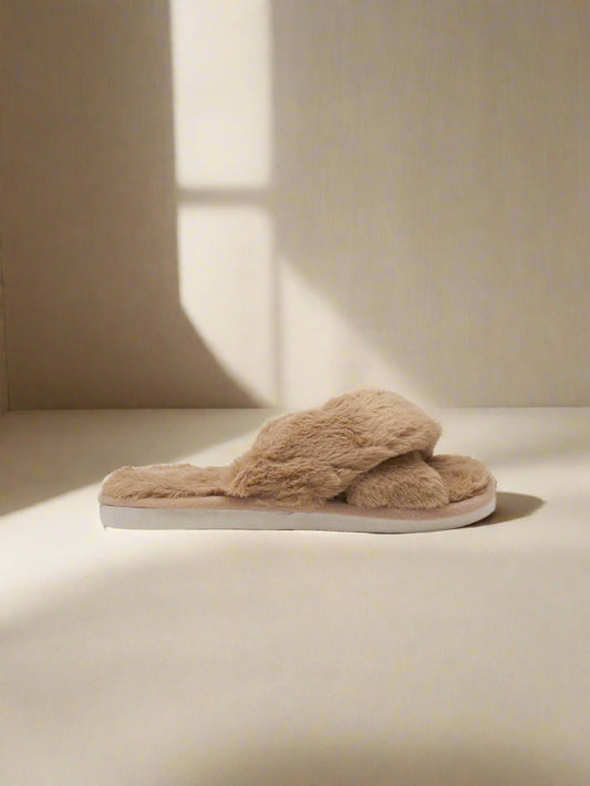 Γυναικείες μπεζ παντόφλες με χιαστί φάσες από γούνα Υλικό: Συνθετική γούνα Σόλα: Λάστιχο Φόρμα: Κανονική...