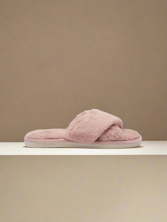 Γυναικείες ροζ παντόφλες με χιαστί φάσες από γούνα Υλικό: Συνθετική γούνα Σόλα: Λάστιχο Φόρμα: Κανονική...