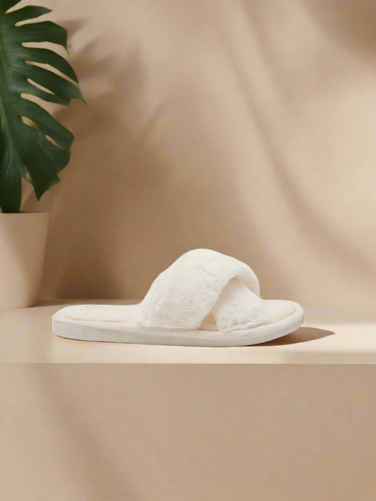 Γυναικείες λευκές παντόφλες με χιαστί φάσες από γούνα Υλικό: Συνθετική γούνα Σόλα: Λάστιχο Φόρμα: Κανονική...