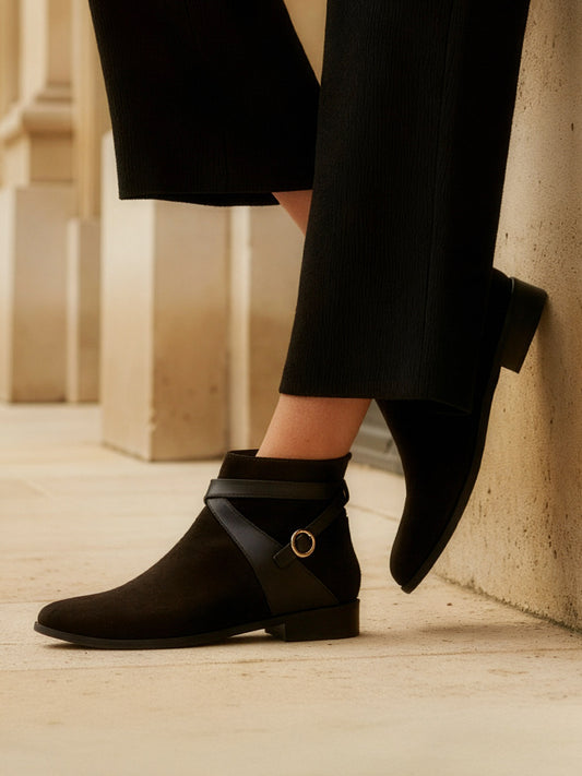 The Miriam ankle boots have a circular golden buckle on the side. They're made from...