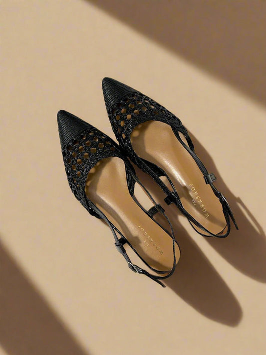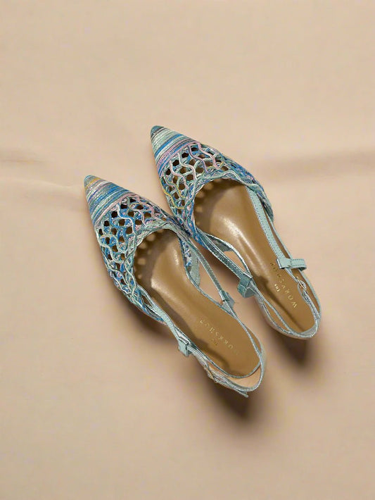 Step into cool tones with these blue slingback flats, designed with a pointed toe and...