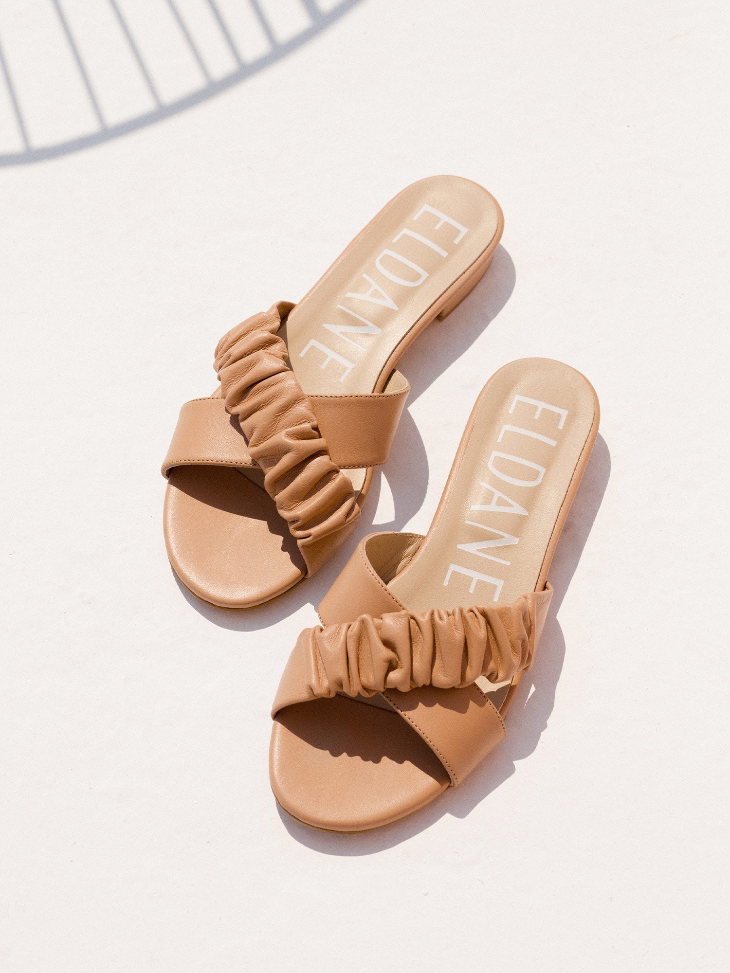 The Mia flat sandals are decorated with a ruched nude leather strand. This round-toe pair has soft leather cross-over straps that beautifully frame your feet and is set on cushioned insoles for a comfortable fit.