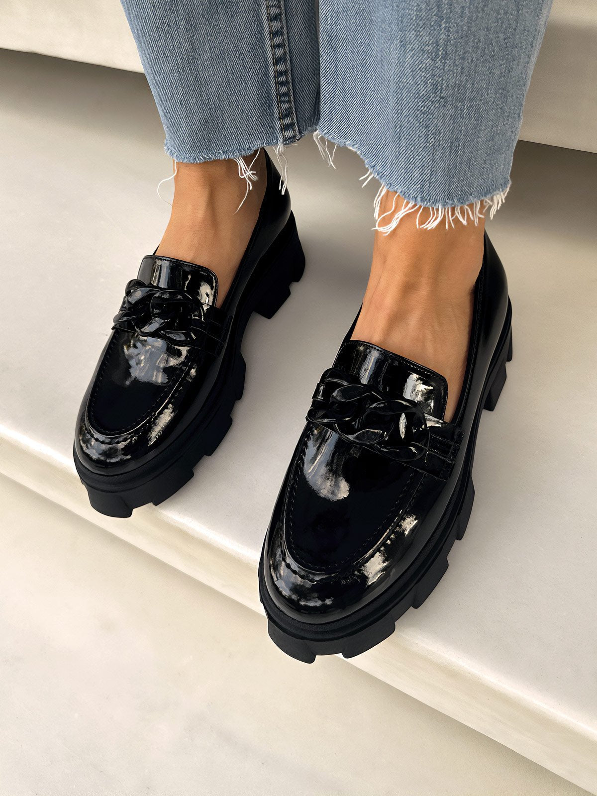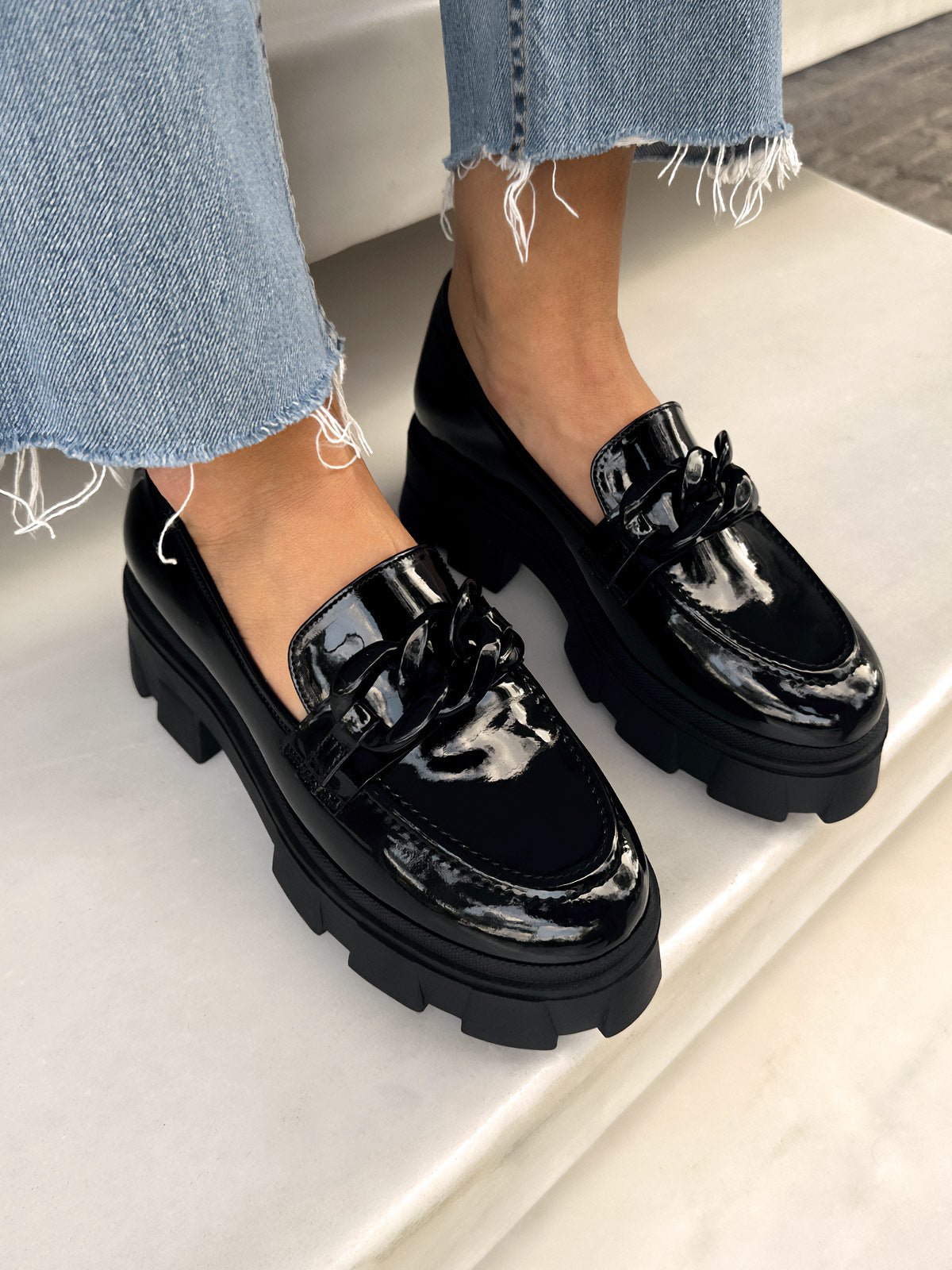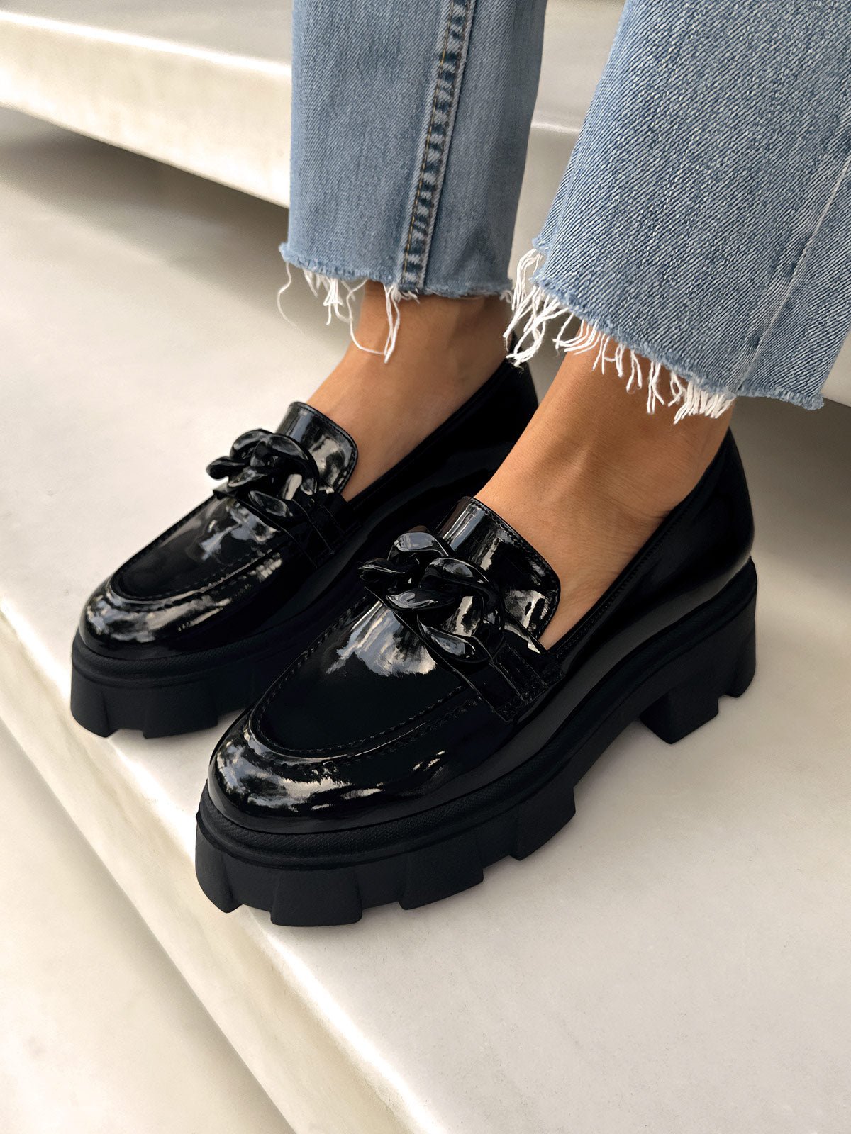 Elevate your style with Imogen Black Gloss Leather Loafers featuring a stylish black chain detail. These high-quality loafers are perfect for various occasions.