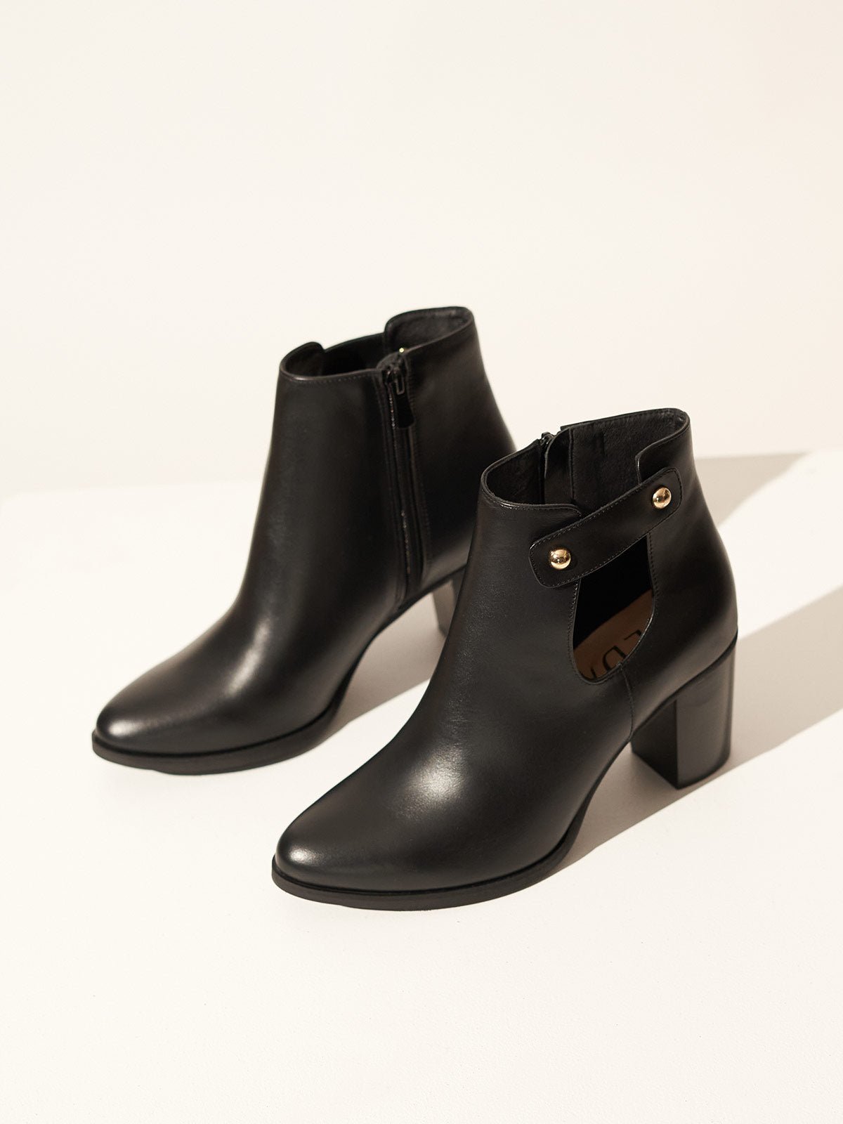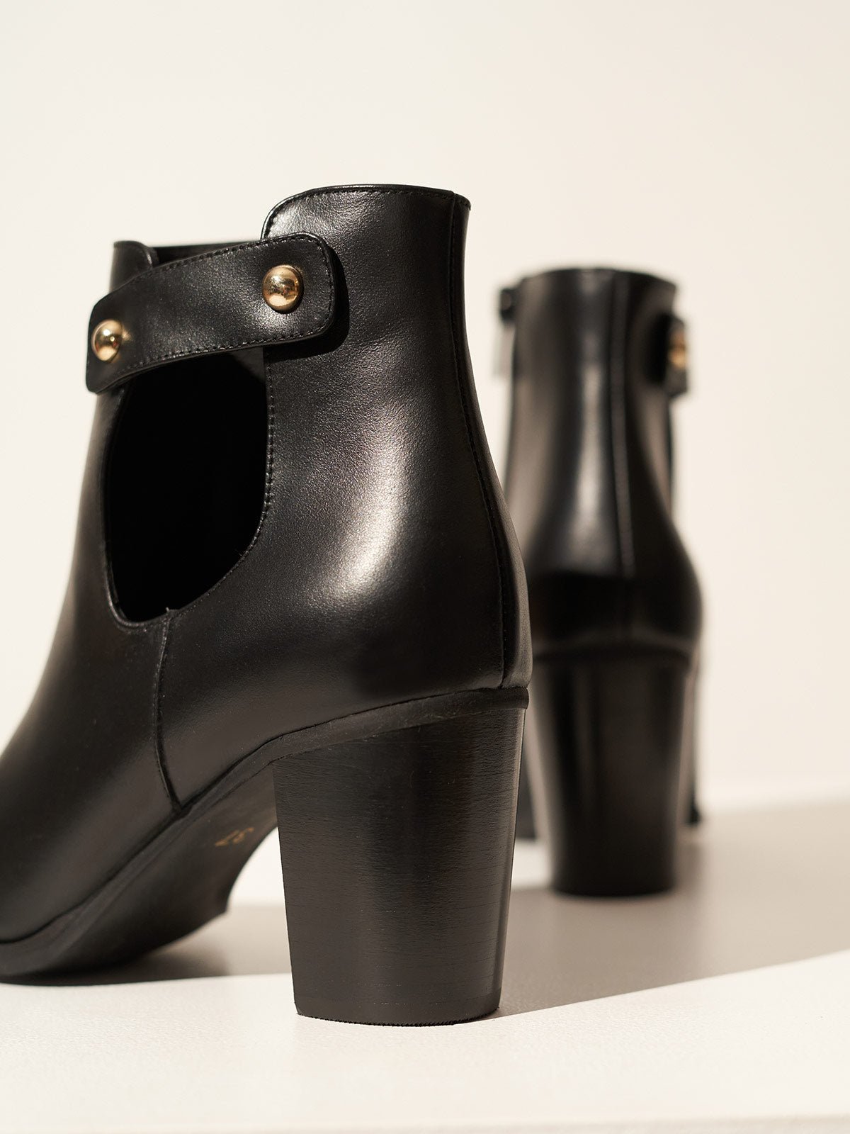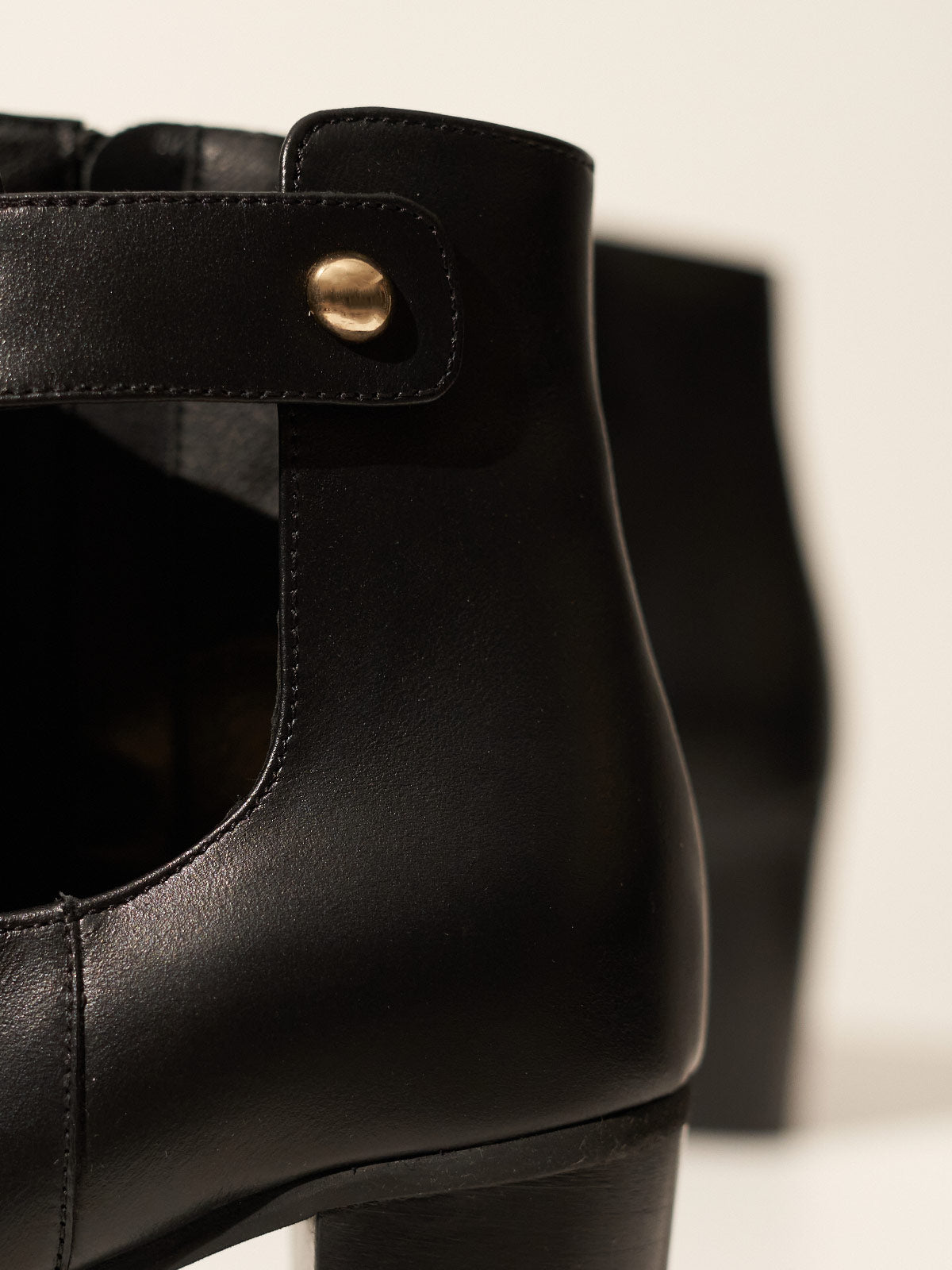 The Estelle boots have been meticulously crafted from smooth black leather that's polished to the highest shine. They're set on a stacked block heel and have slightly pointed toes.