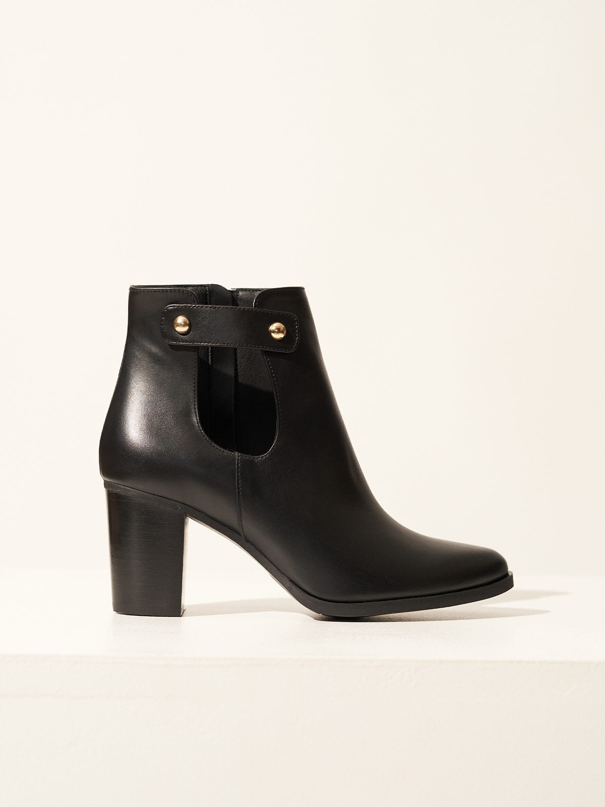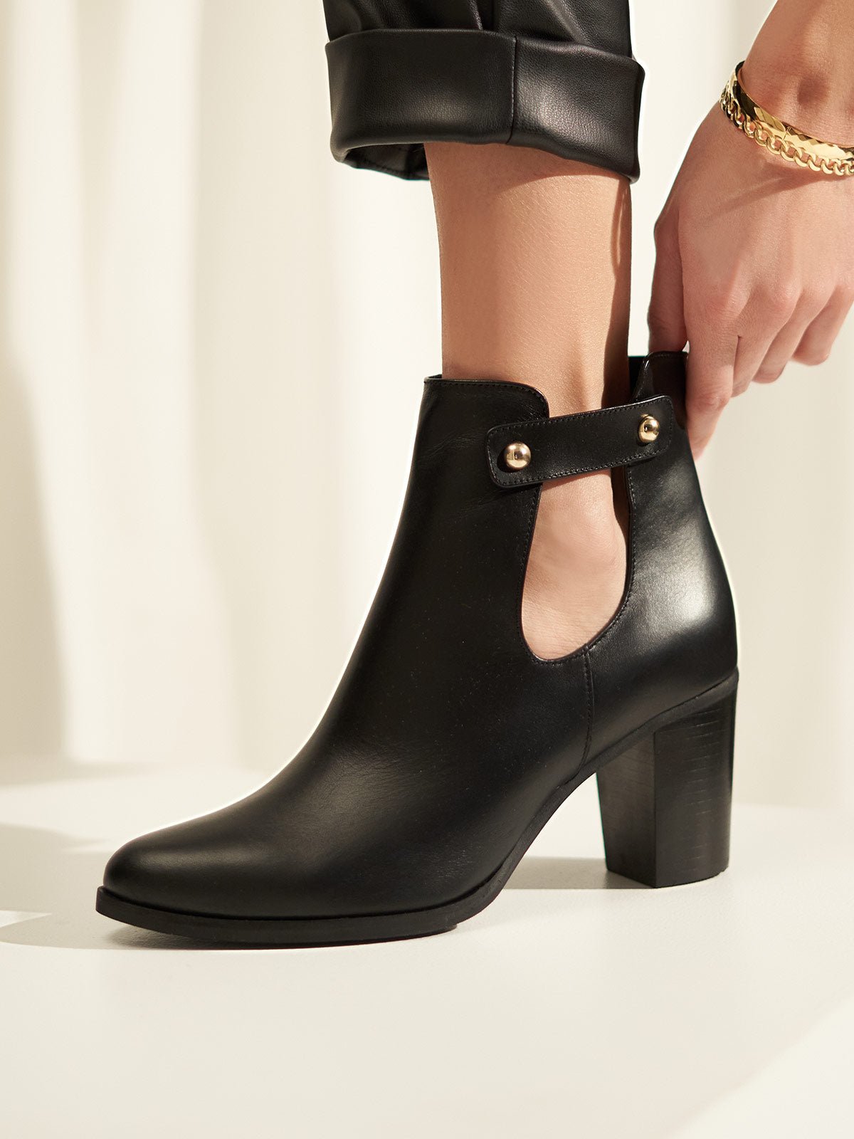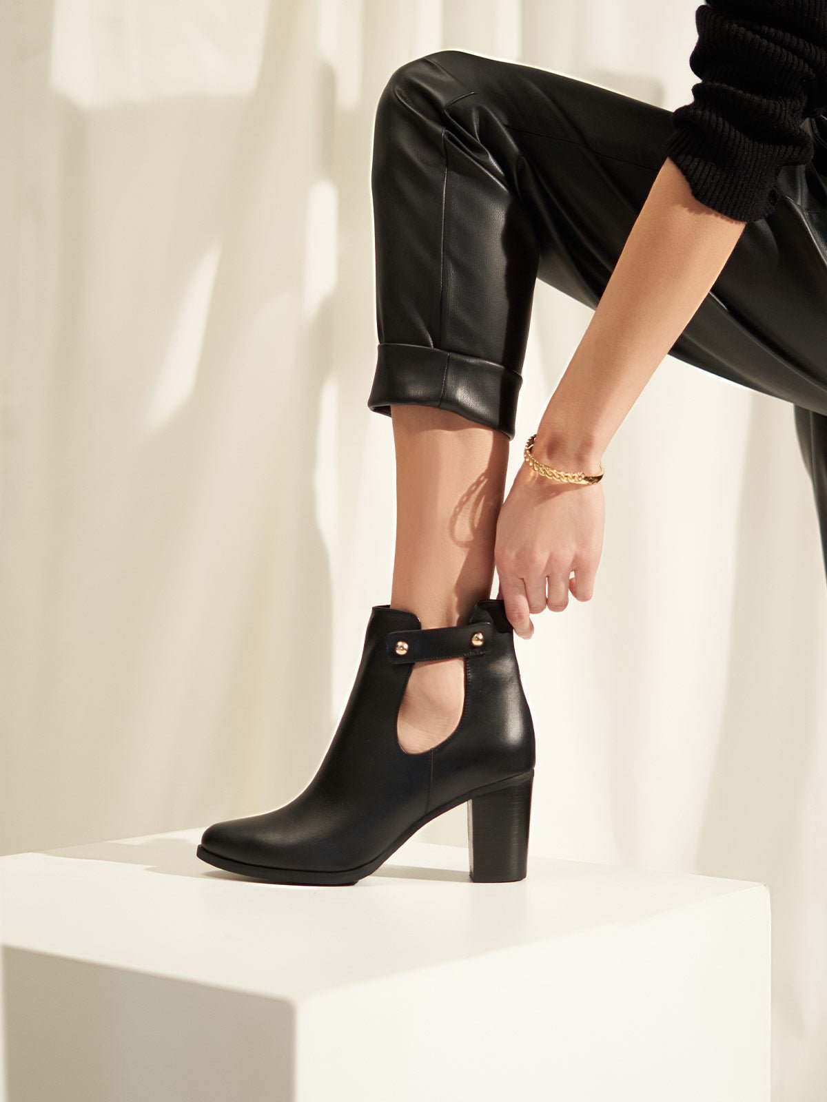 The Estelle boots have been meticulously crafted from smooth black leather that's polished to the highest shine. They're set on a stacked block heel and have slightly pointed toes.